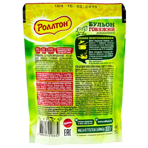Бульоны Роллтон являются лидером в категории бульонов. В новых обновленных бульонах Роллтон теперь еще больше овощей и зелени, что придаст вашим блюдам насыщенный вкус и аромат. Продукт может содержать незначительное количество сельдерея, продуктов переработки яиц, молока, злаков, содержащих глютен.