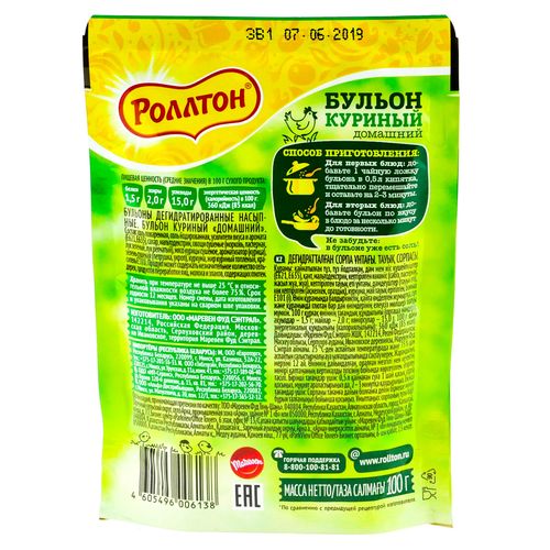 Домашний бульон "Роллтон" имеет превосходный вкус и содержит великолепный букет сушеных овощей и специй, которые придают ему неповторимый аромат. Кроме того, в составе бульона входит йодированная соль, которая является необходимым элементом здорового питания взрослых и детей. Незаменимый помощник для приготовления супов и ароматных вторых блюд. Оцените ароматный куриный бульон по-домашнему от "Роллтон" и угостите им самых близких за семейным столом! Продукт может содержать незначительное количество сельдерея, продуктов переработки яиц, молока и злаков, содержащих глютен.