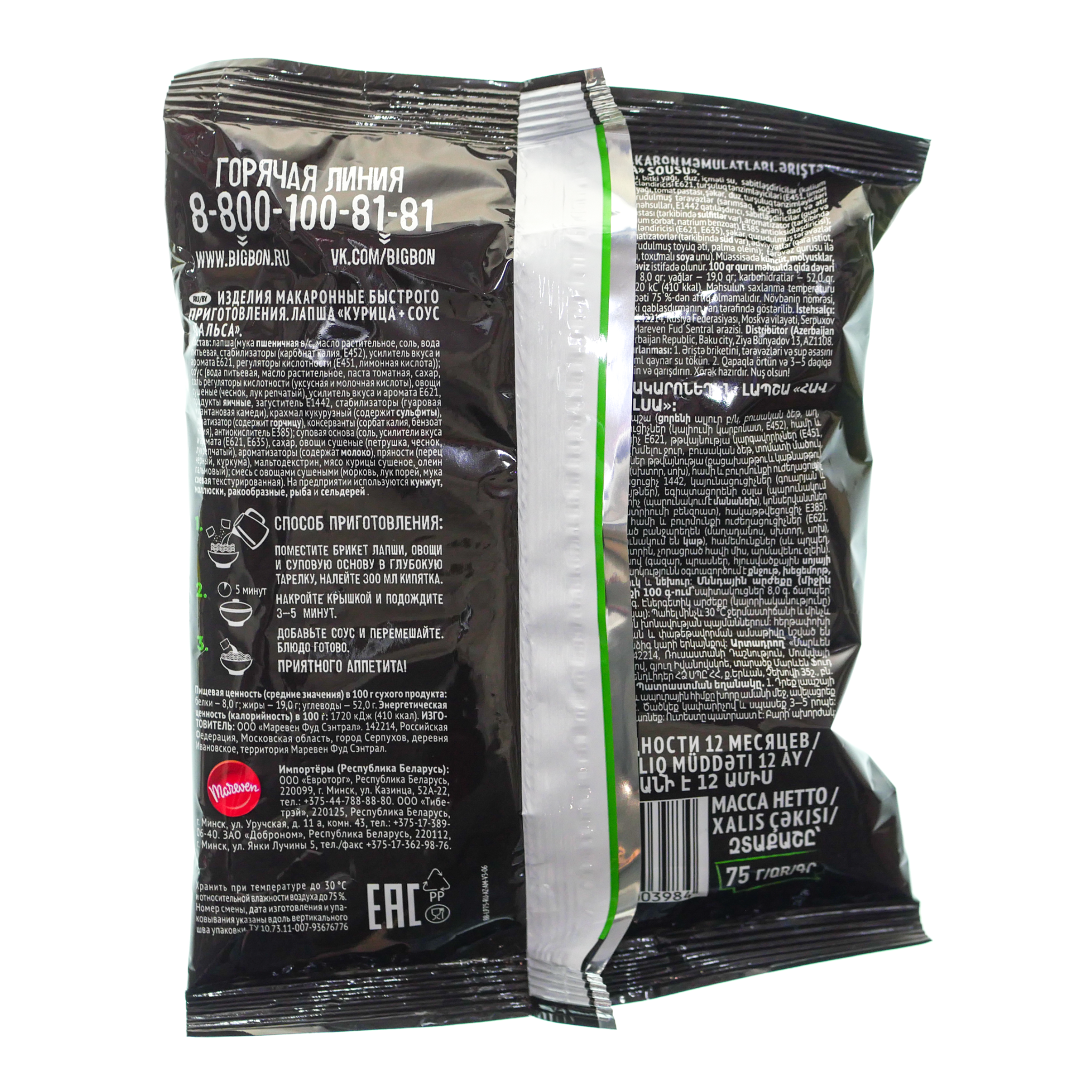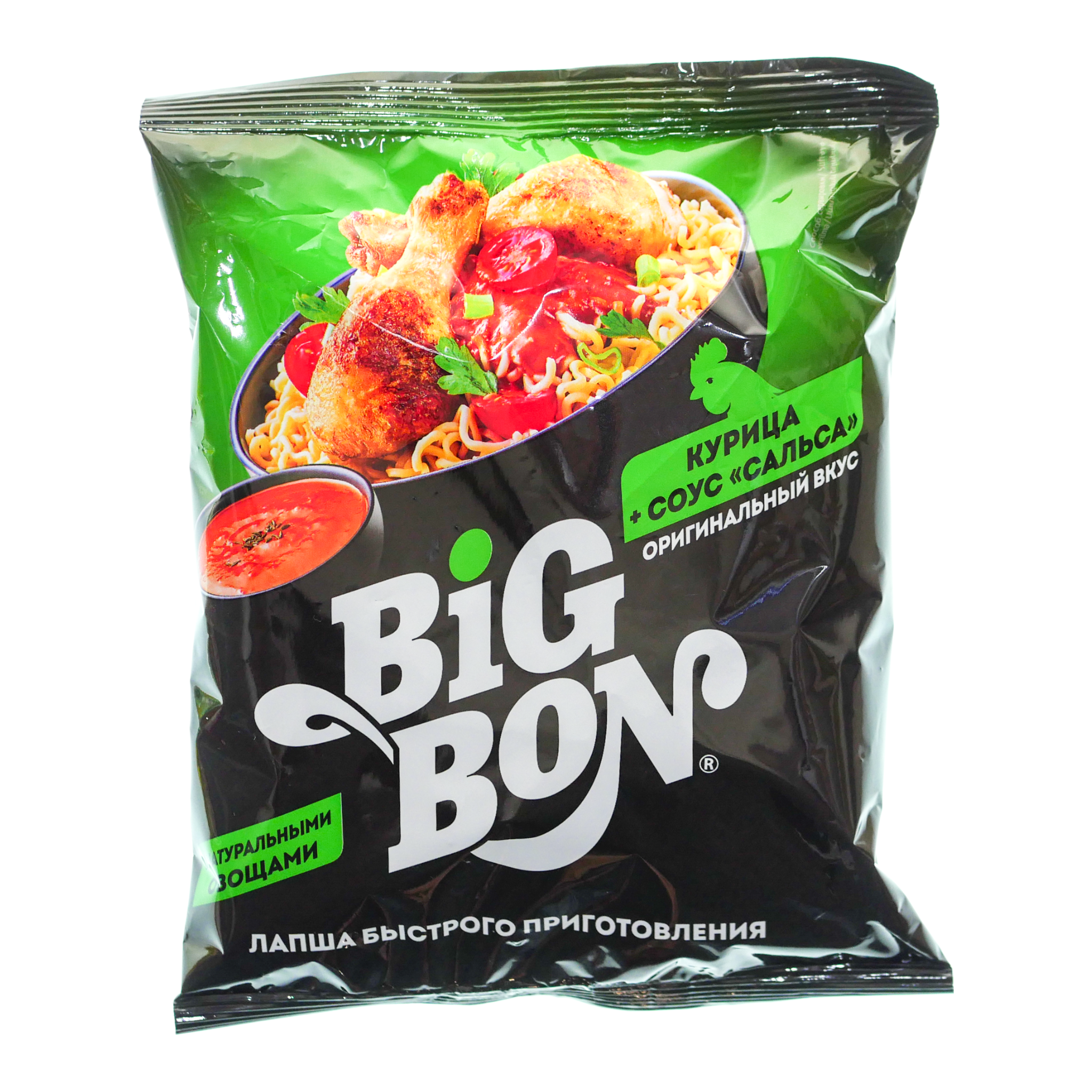 Лапша быстрого приготовления Big Bon «Курица и соус сальса» (75 г) — макаронное изделие с добавлением кусочков курицы, сушёных овощей и насыщенного, пряного сладко-кислого соуса сальса.