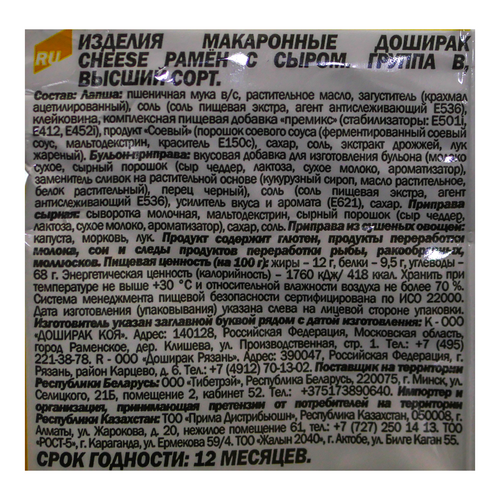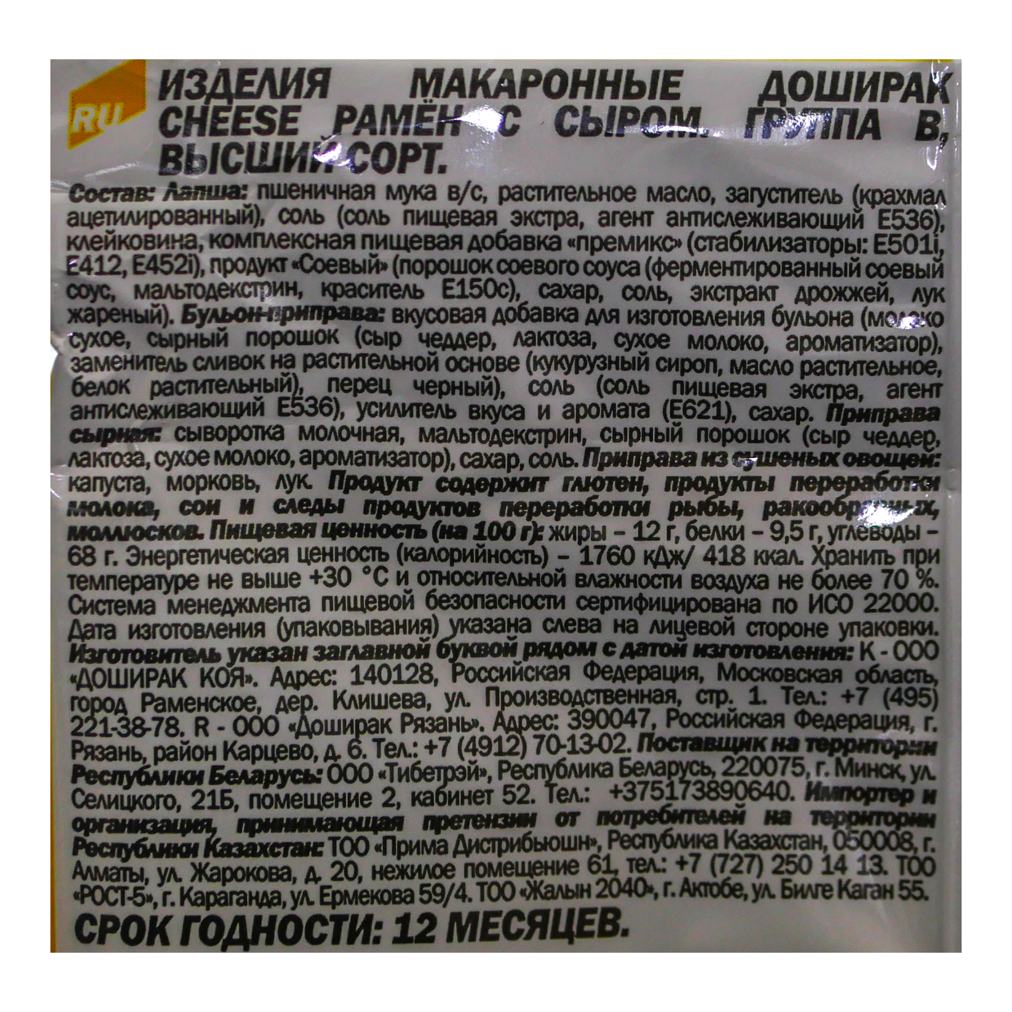 Состав: Лапша: пшеничная мука высший сорт, масло растительное, пищевая добавка загуститель (крахмал ацетилированный), соль, пищевая добавка эмульгатор «к-300а» (соевое масло, лецитины), клейковина, комплексная пищевая добавка стабилизатор «премикс» (стабилизаторы: Е501i, Е412, Е452i), продукт "Соевый" (порошок соевого соуса, сахар, соль, экстракт дрожжей, лук жареный).