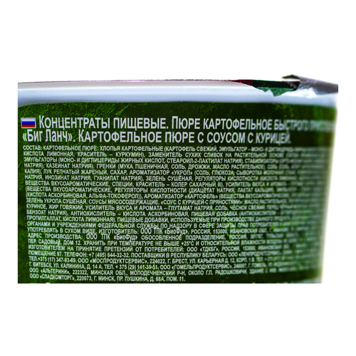 Картофельное пюре быстрого приготовления "Биг Ланч" с гренками и со вкусом курицы. Способ приготовления: Залить содержимое стаканчика кипящей водой. Перемешать, закрыть крышкой. Через 3-4 минуты пюре готово. Приятного аппетита!