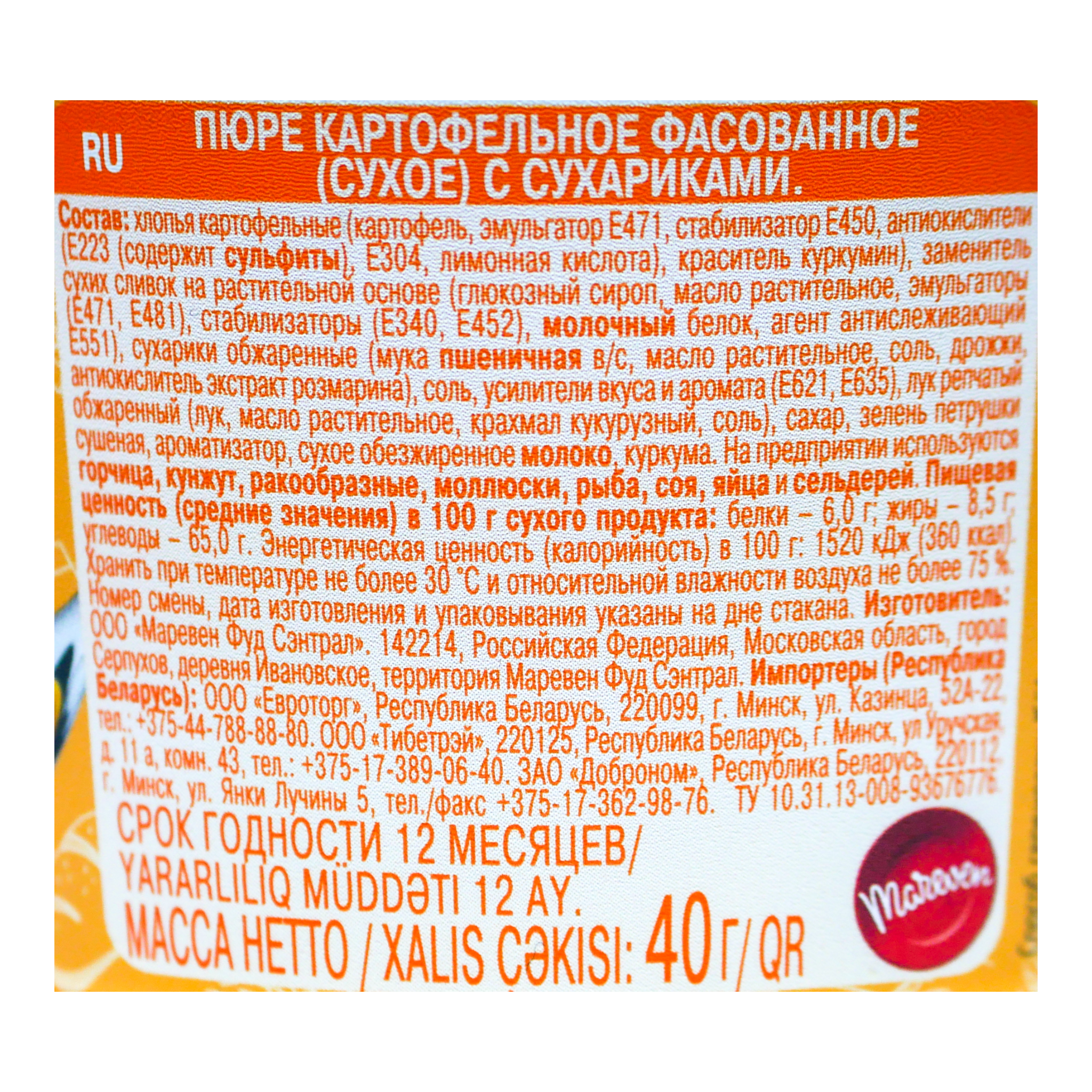 Состав: Ххлопья картофельные (картофель (99%), эмульгатор (Е471), стабилизаторы (Е450i, Е450iii), антиокислители (аскорбиновая и лимонная кислоты, Е223, Е304i), краситель (куркумин)), заменитель сухих сливок на растительной основе (глюкозный сироп, масло растительное, молочный белок, стабилизаторы (Е340, Е452), эмульгаторы (Е471, Е481), агент антислеживающий (Е551)), гренки пшеничные (мука пшеничная в/с, масло растительное, соль, дрожжи, антиокислитель (экстракт розмарина), консервант (Е282)), соль, сухое обезжиренное молоко, сушеные овощи и зелень (лук репчатый жареный (лук, масло растительное, мука пшеничная в/с, соль), петрушка), усилители вкуса и аромата (Е621, Е635), сахар, ароматизатор, куркума. Продукт может содержать незначительное количество продуктов переработки яиц.