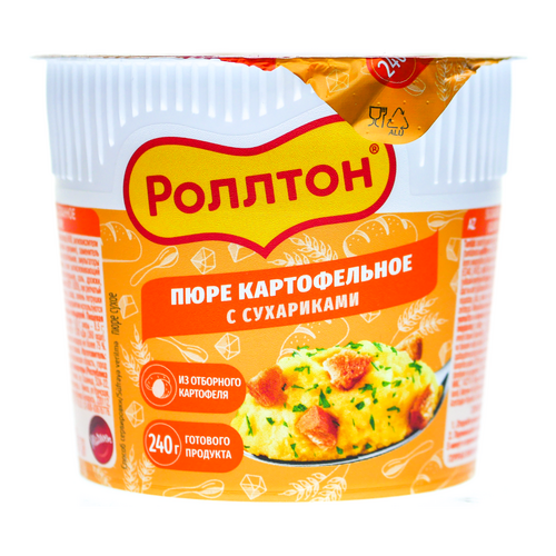 Бренд «Роллтон» – лидер рынка картофельного пюре. Картофельное пюре от «Роллтон» создано в соответствии с лучшими традициями и вкусовыми предпочтениями потребителей из самых высококачественных ингредиентов. Оно обладает нежным вкусом и приятным ароматом. При производстве используются только отборные хлопья из натурального картофеля. Аппетитное пюре можно приготовить за 5 минут – необходимо всего лишь залить содержимое стакана кипятком, перемешать и можно приступать к еде!