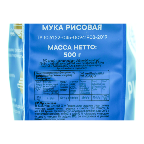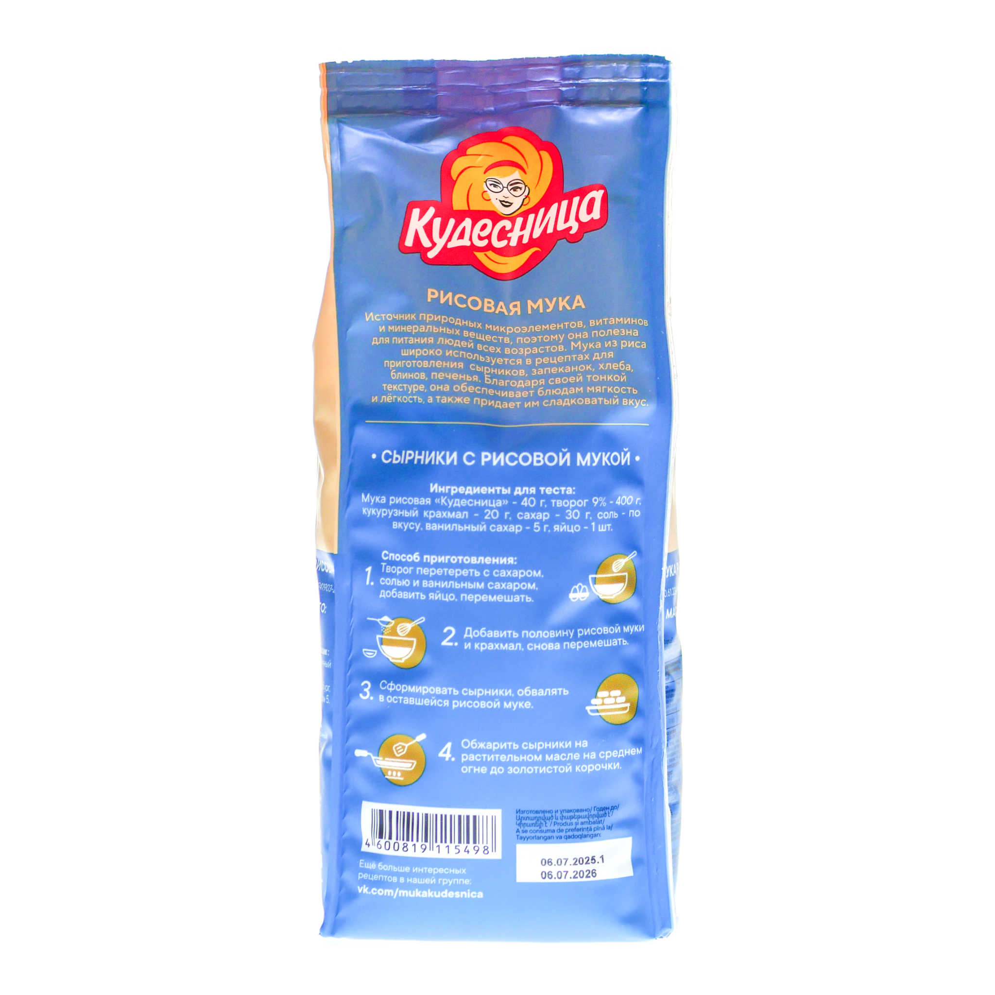 Рисовая мука Кудесница - источник разнообразных природных микроэлементов, витаминов и минеральных веществ, что делает ее исключительно полезной. Она идеально подходит для людей придерживающихся диетического питания , а также для детей. Продукт может содержать следы глютена, молочных, соевых, яичных продуктов и кунжута.
