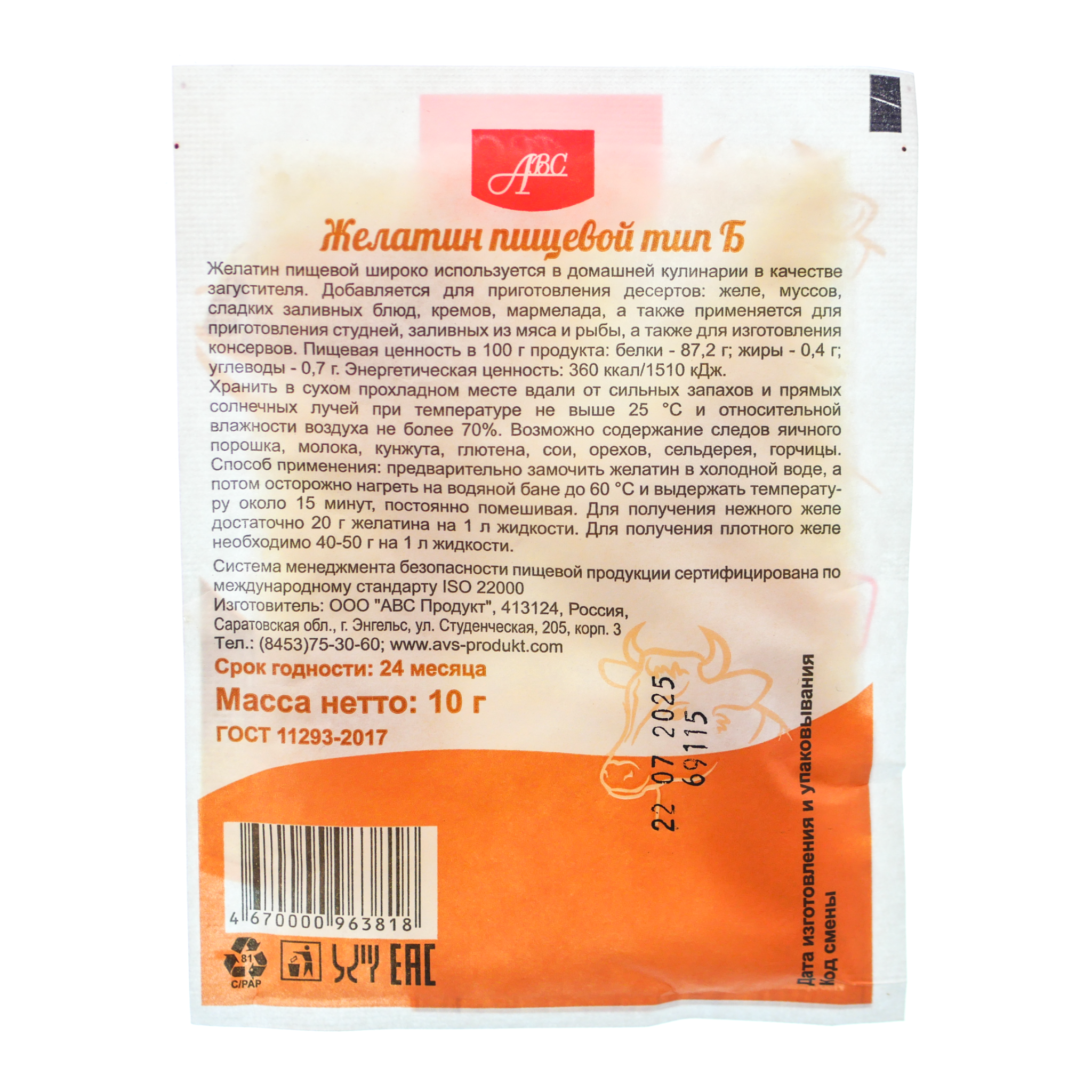 Желатин АВС 10г пищевой