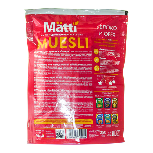 Мюсли "Matti" - изысканный вариант для сбалансированного и полезного завтрака на каждый день. Овсяные хлопья богаты клетчаткой, минеральными веществами и витаминами, которые способствуют выведению шлаков из организма, регулируют работу пищевого тракта, снижают уровень сахара в крови.
