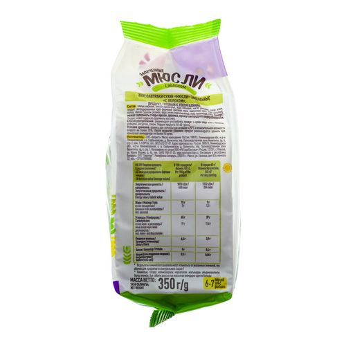 Состав: Хлопья овсяные, хлопья пшеничные, вода питьевая, рапсовое масло, сахар, изюм, мука продукт экструдированных круп формовой (рисовая мука, пшеничная мука, вода питьевая), патока, яблоко сушеное резаное, ядра семян подсолнечника, мука пшеничная, соль.