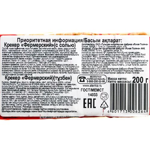 Крекер с классическим солёным вкусом – отличная замена сладкого печенья. Может использоваться как основа для бутербродов. Без искусственных красителей. Возможно наличие незначительного количества продуктов яичных. Противопоказано при индивидуальной непереносимости белка молока.
