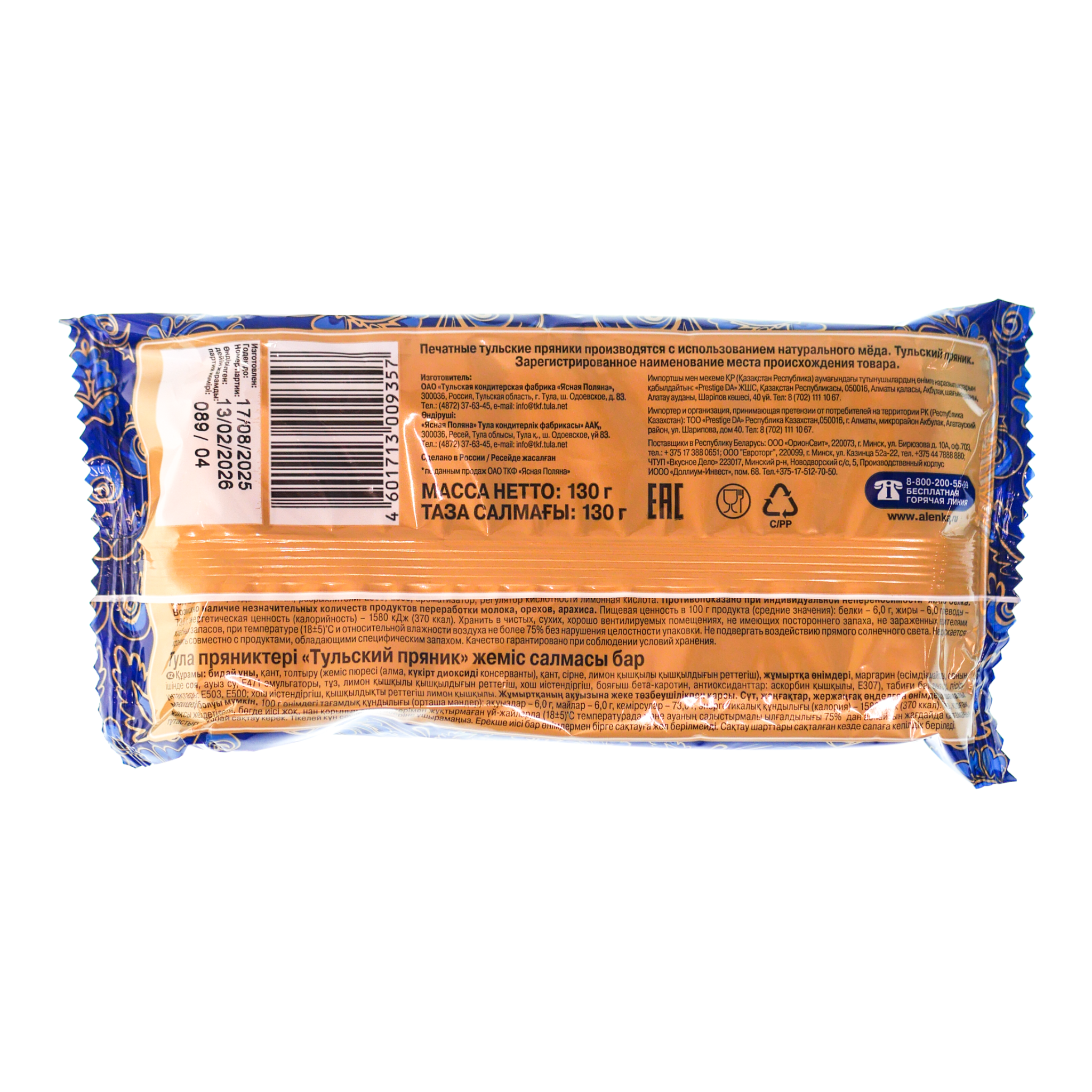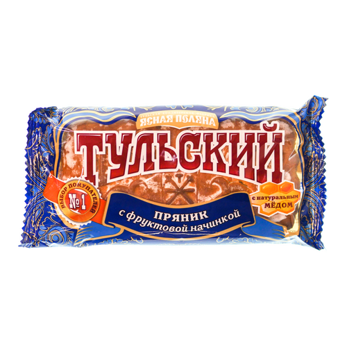Тульский пряник с начинкой из фруктового повидла, покрытый тонкой белесой гладью сахарной глазури. Пряную сладость ароматного печатного коржа дополняет легкая фруктовая кислинка густой начинки. Настоящий тульский пряник, гордость региона и визитная карточка фабрики «Ясная Поляна». Вкус, достойный царской трапезы.