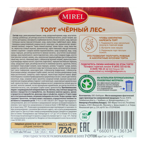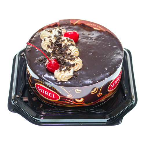 Торт Мирель «Чёрный лес» весом 720 г — это бисквитный десерт от производителя ОАО «Хлебпром». Он представляет собой шоколадный торт с кремом со вкусом сливок и вишней. Противопоказано людям с индивидуальной непереносимостью глютена, яиц и яичных продуктов молока и продуктов его переработки, сои. Возможно наличие арахиса, орехов и продуктов их переработки, диоксида серы и сульфитов, кунжута. В торте содержится натуральная вишня, возможно попадание косточек.