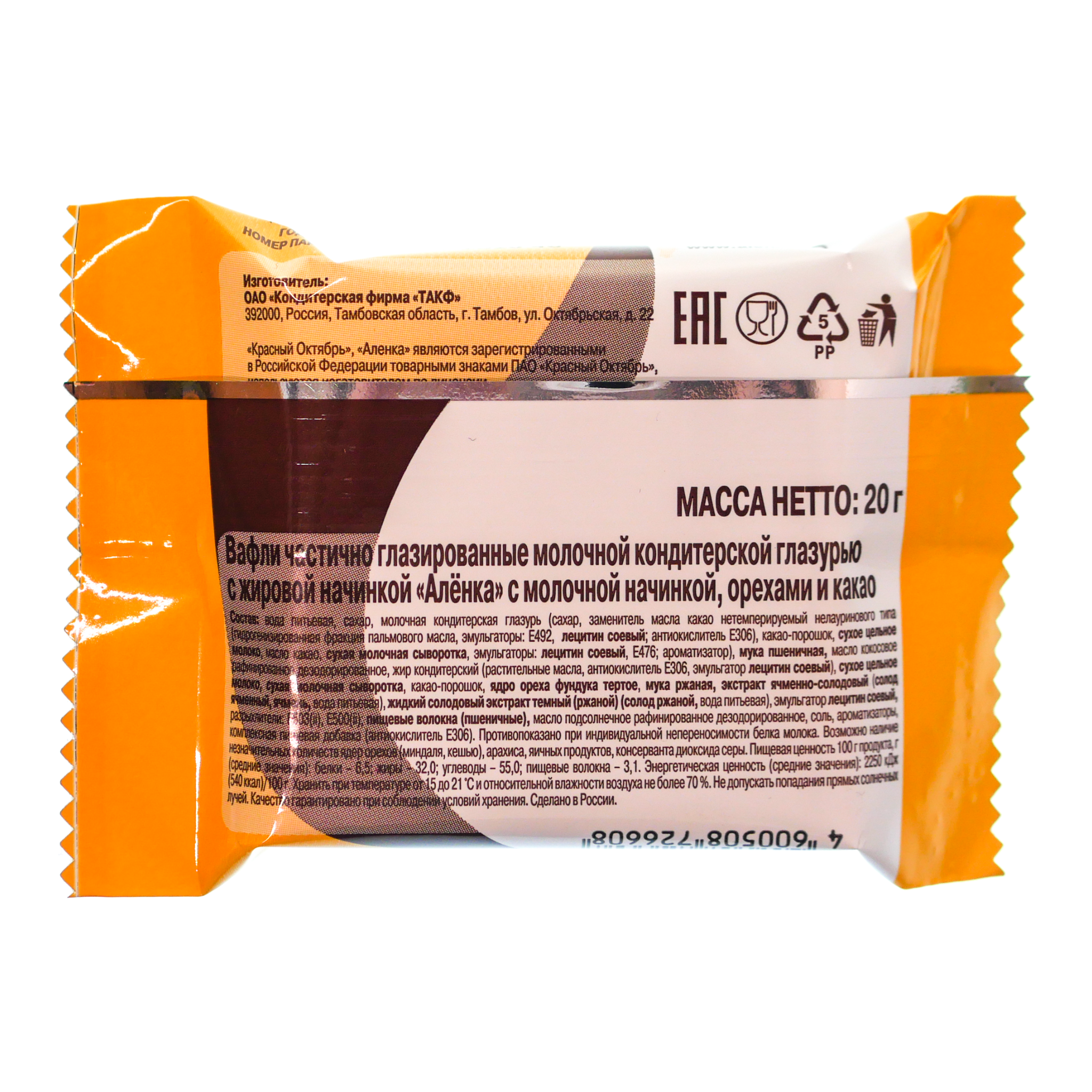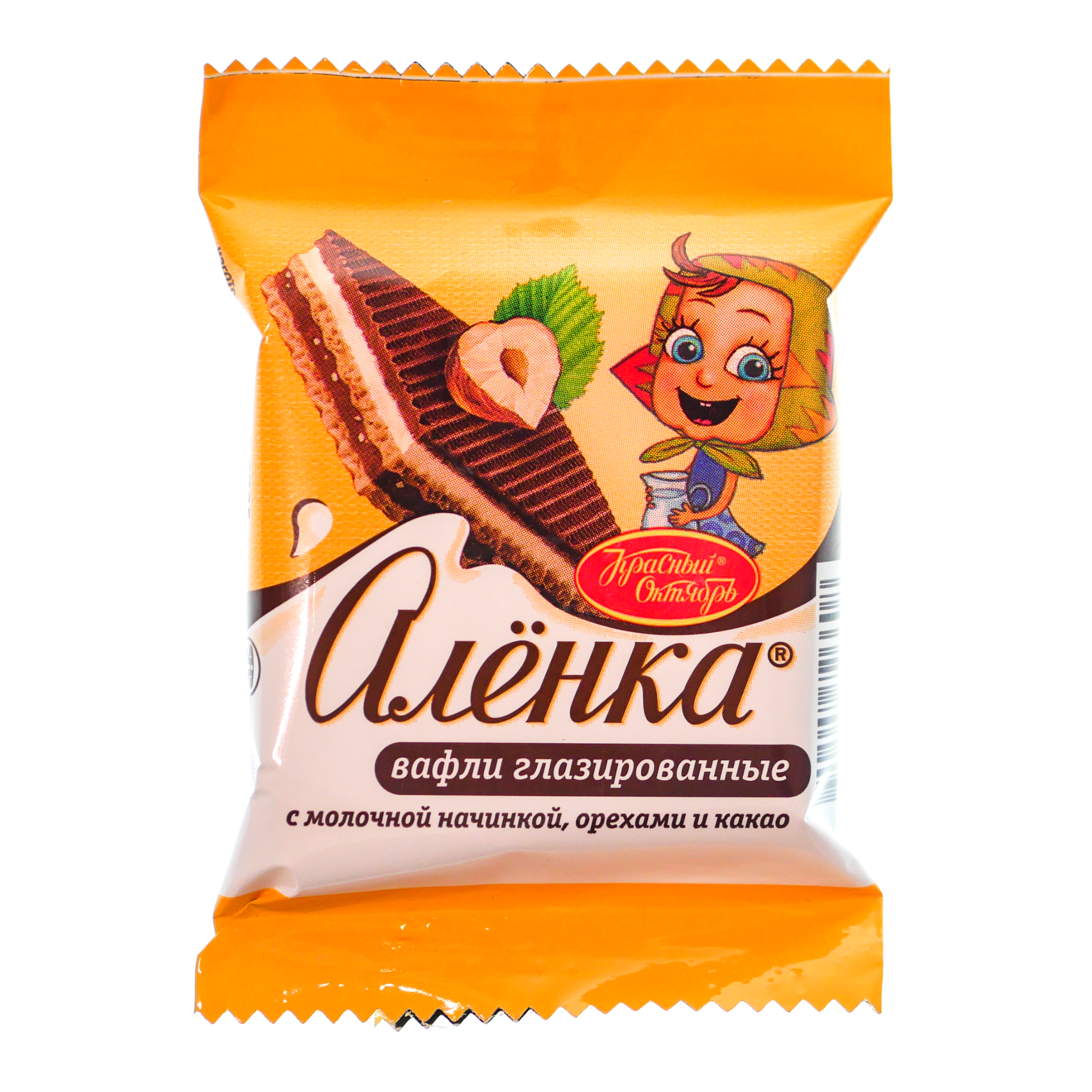 Вафли частично глазированные молочной кондитерской глазурью с жировой начинкой «Алёнка» с молочной начинкой, орехами и какао.