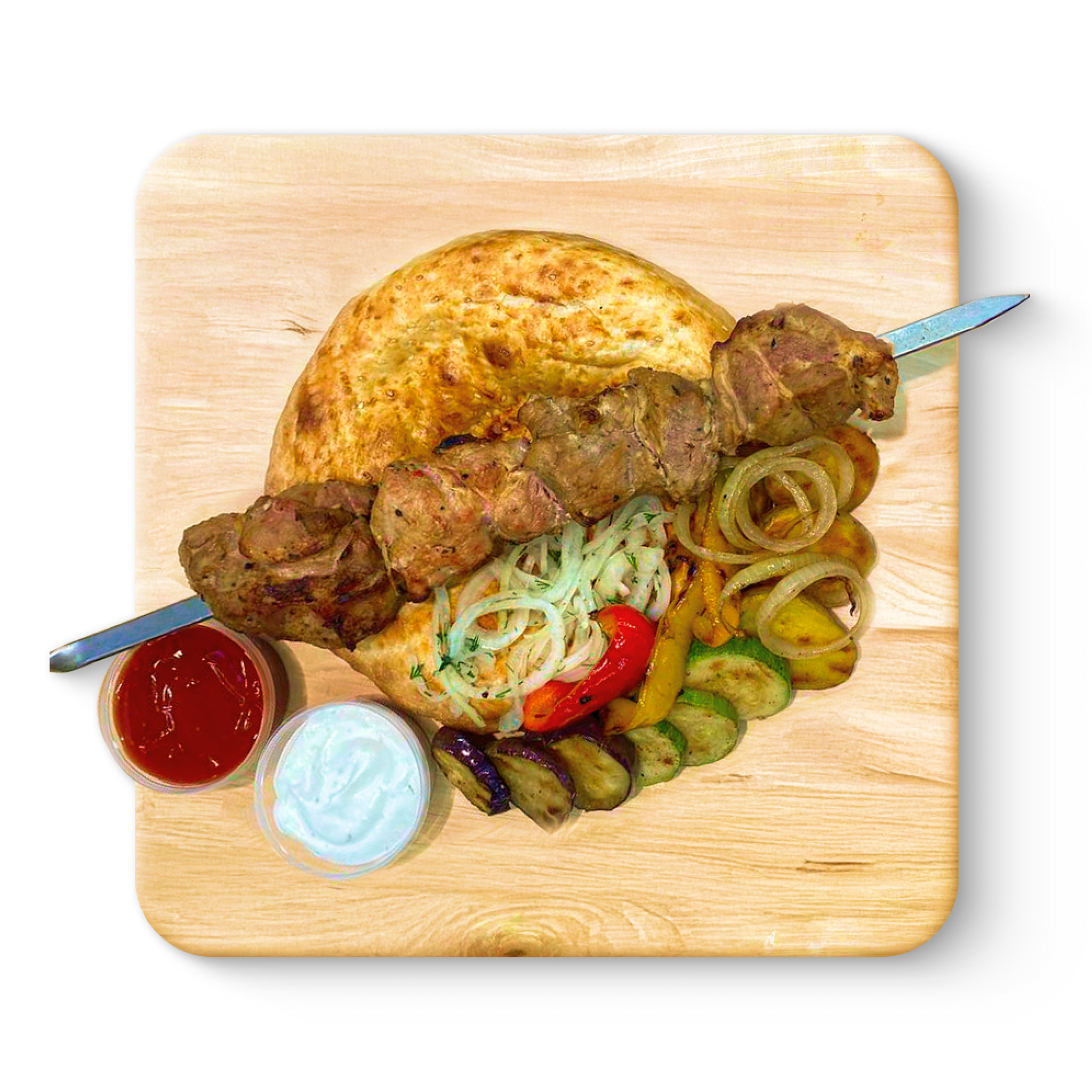Комбо "Для двоих": шашлык из свиной  шейки, картофель жареный на мангале, овощи гриль, лук маринованный, соус чесночный, соус томатный, лепешка тандырная.