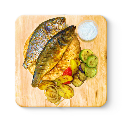 Комбо "Фиш": дорадо на мангале, сибас жареный на мангале, овощи гриль, соус цезарь, лепешка тандырная.