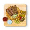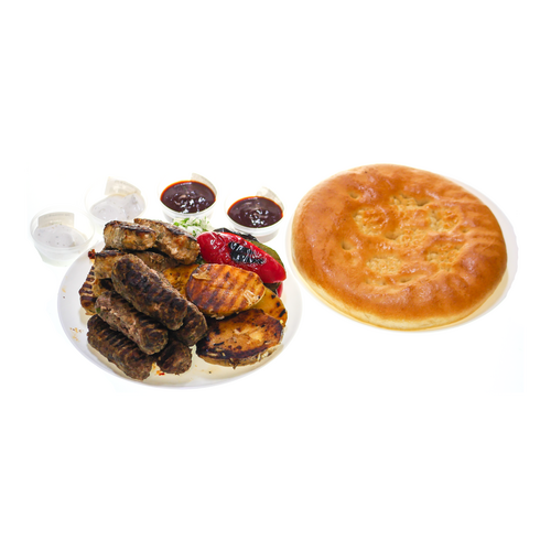 Комбо "Кавказ": люля-кебаб из курицы, люля-кебаб свинина/говядина, картофель жареный на мангале, овощи гриль, лук маринованный, соус чесночный, соус томатный, лепешка тандырная.