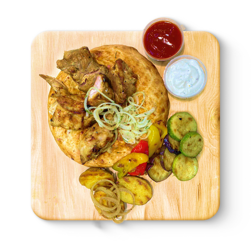 Комбо "На ужин": шашлык из свиной шейки, чахохбили по-кавказски жареный по рецепту Караван, картофель жареный на мангале, овощи гриль, лук маринованный, соус чесночный, соус томатный, лепешка тандырная.