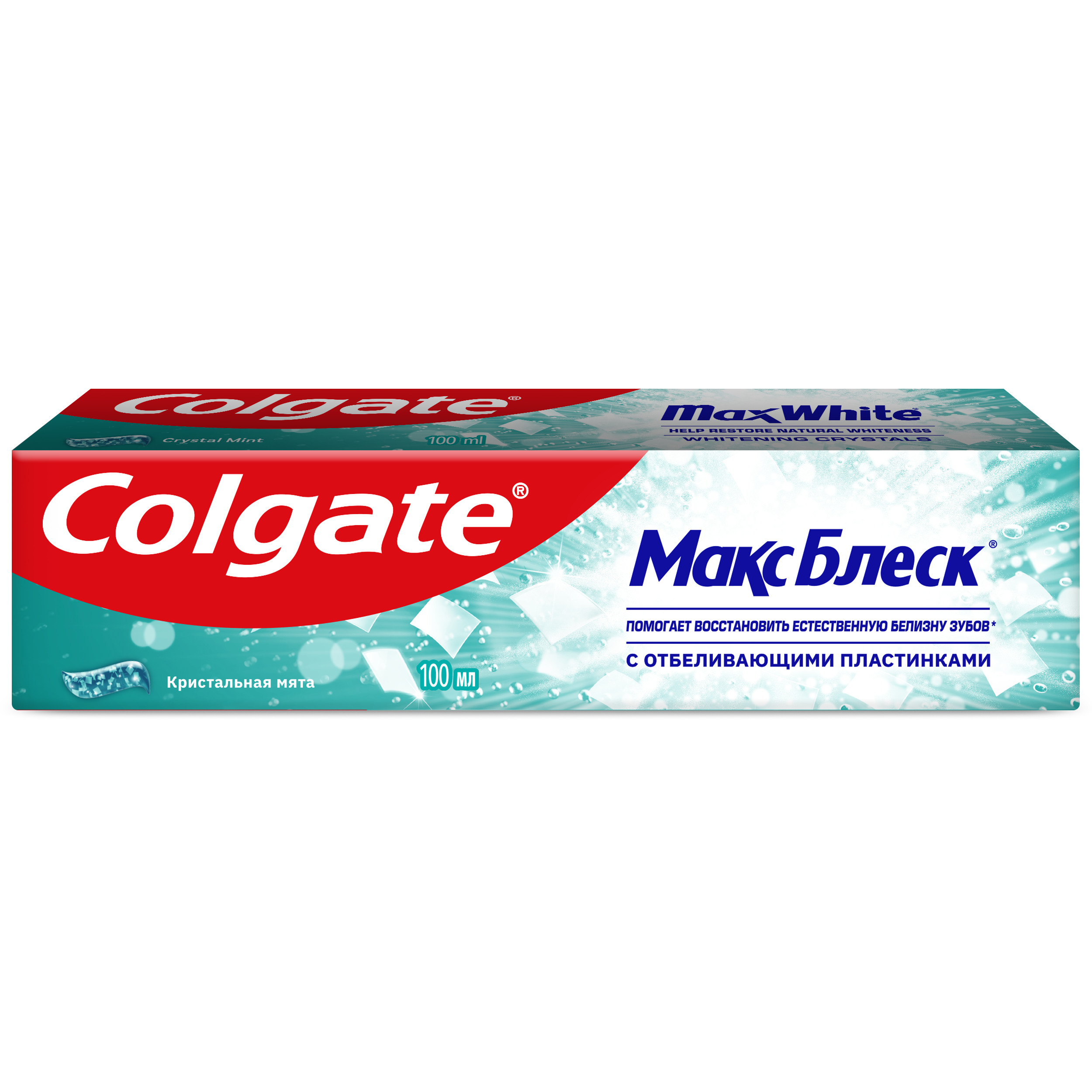 Тысячи отбеливающих пластинок, входящие в состав зубной пасты Colgate Макс Блеск, придают зубам сияющую белизну ослепительной улыбки.Заряжает отбеливающей силой во время чистки зубов и оставляет дыхание свежим надолго.Отбеливает зубы,борется с кариесом,освежает дыхание,помогает восстановить естественную белизну.