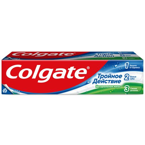 Зубная паста Colgate Тройное Действие обеспечивает максимальную защиту от кариеса. Эта трехцветная зубная паста оказывает тройное действие: помогает защищать зубы от кариеса, помогает удалять потемнения с поверхности зубов и освежает дыхание. Что немаловажно, Colgate Тройное Действие обладает приятным мятным вкусом!