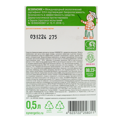 Ср-во д/мытья посуды/игрушек Синергетик 0,5л апельсин биоразлагаемое