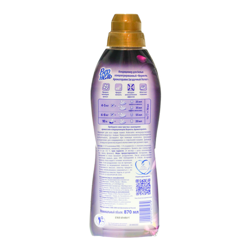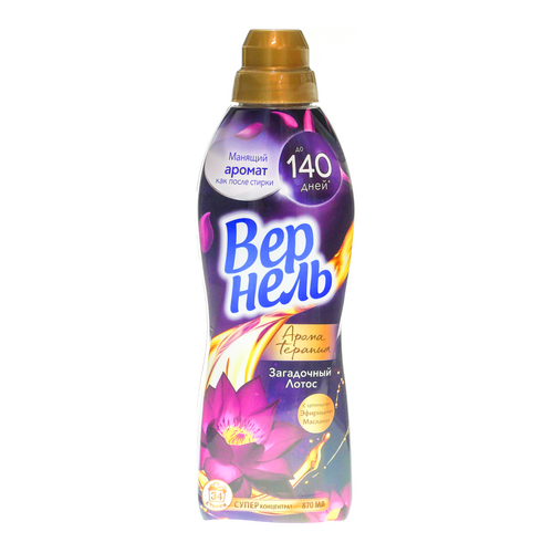 Концентрированный кондиционер для белья Вернель Ароматерапия Загадочный лотос подарит Вашему белью не только невероятную мягкость, но и магический аромат лотоса, а благодаря специальным аромакапсулам в составе кондиционер для стирки Вернель позволит наслаждаться интенсивным ароматом белья до 140 дней.