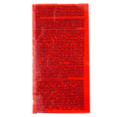 Состав: 5-15% анионные ПАВ, <5% неионогенные ПАВ, отбеливающие вещества на основе кислорода, фосфонаты, поликарбоксилаты,цеолиты, энзимы, оптические отбеливатели, ароматизирующие добавки.