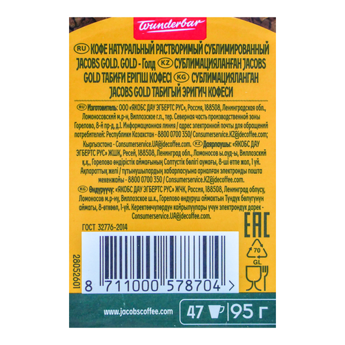 Растворимый сублимированный кофе Якобс Голд 95 г отличается нежным, но в то же время насыщенным сбалансированным вкусом. Благодаря специальной мягкой обжарке отобранных зёрен получается утончённый аромат, а напиток оставляет приятное послевкусие. Подходит в качестве дополнения к десерту, а также как самостоятельный напиток для кофе-тайм. Кофе Якобс Голд отлично сочетается с молоком, сливками и другими специями.
