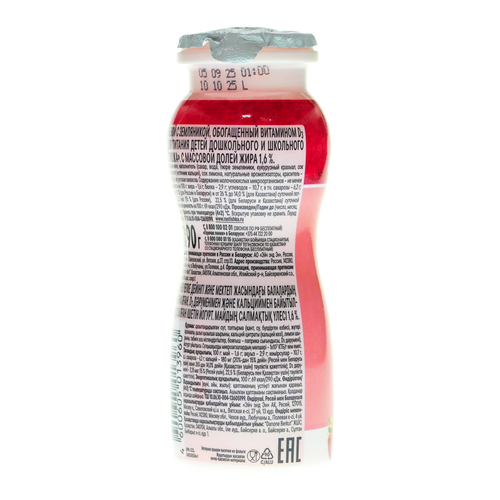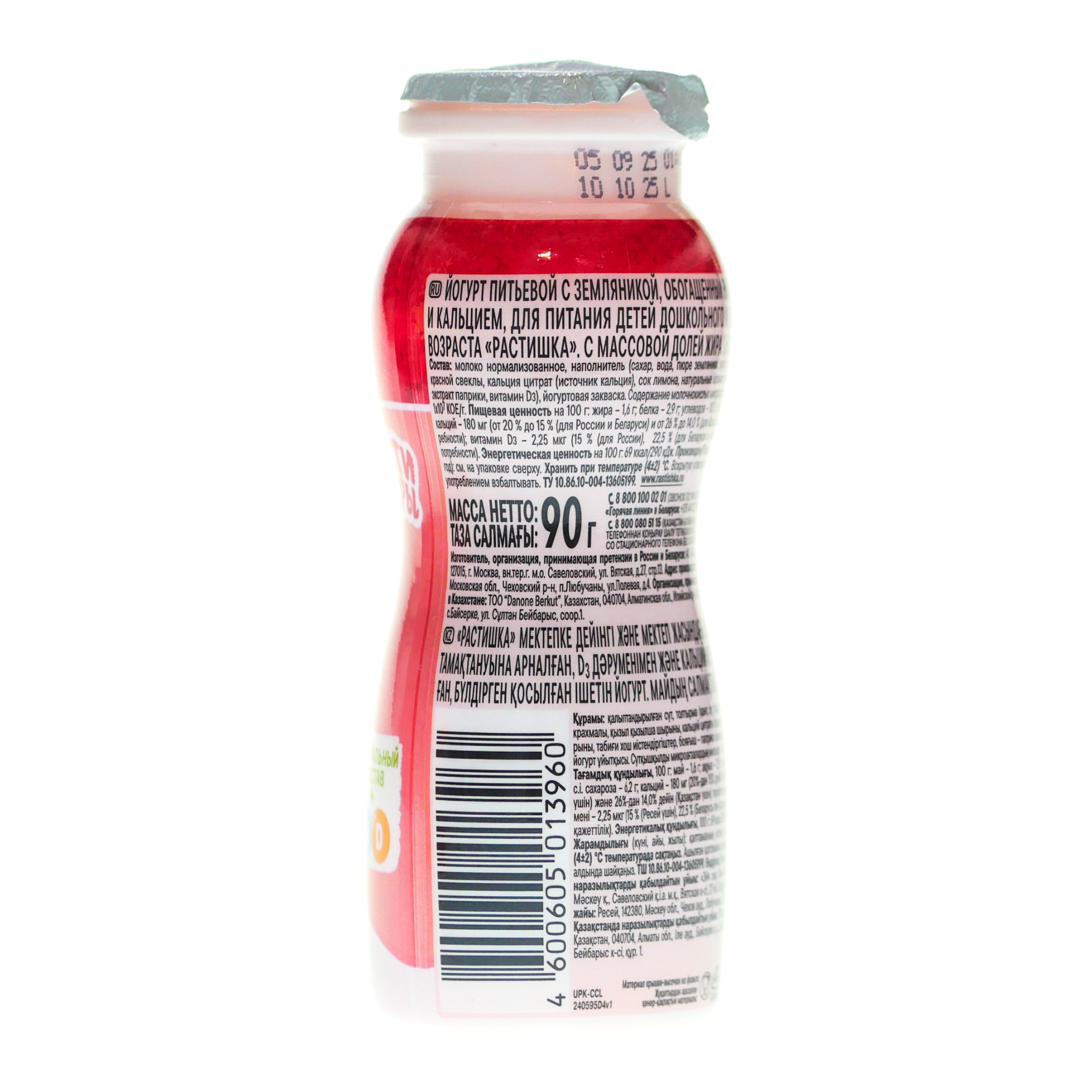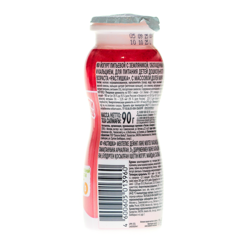 Питьевой йогурт «Растишка» со вкусом земляники 1,6% объёмом 90 г разработан специально для детей старше 3 лет совместно с Институтом питания РАМН.