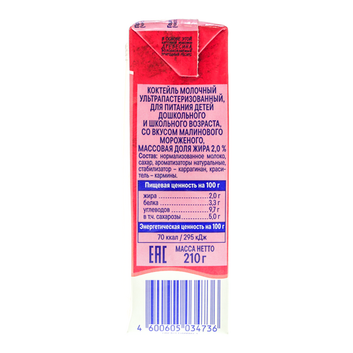 Коктейль Растишка 210г 2% малина морож Данон БЗМЖ