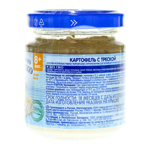 Треска содержит полиненасыщенные жирные кислоты (Омега 3), большое количество витаминов (А, D, витамины группы В) и минеральных веществ (кальция, цинка, фосфора, калия и йода). Входящий в состав картофель обогащает пюре пищевыми волокнами. Без ГМО. Без добавления соли.