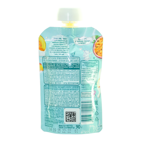 Состав: Пюре из яблок, сахара, пюре из персиков, молоко сухое цельное, сок маракуйи концентрированный, крахмал кукурузный, стабилизатор — пектин, загуститель — камедь ксантановая, аскорбиновая кислота — витамин С, регулятор кислотности — лимонная кислота, вода питьевая.