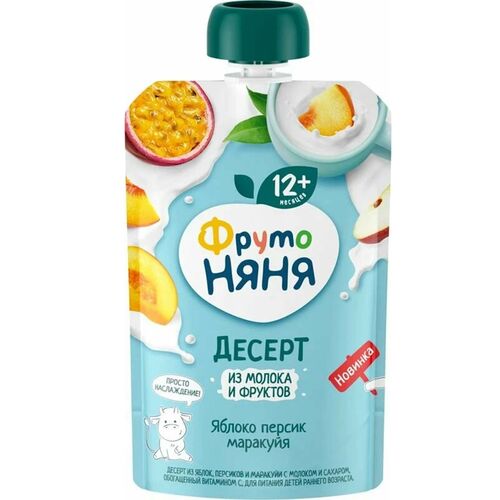 Молочный десерт из яблок, персиков и маракуйи «ФрутоНяня» – это вкусное и полезное угощение с тропическими нотками для детей от 12 месяцев. Продукт приготовлен из 100% натуральных фруктовых пюре и соков.