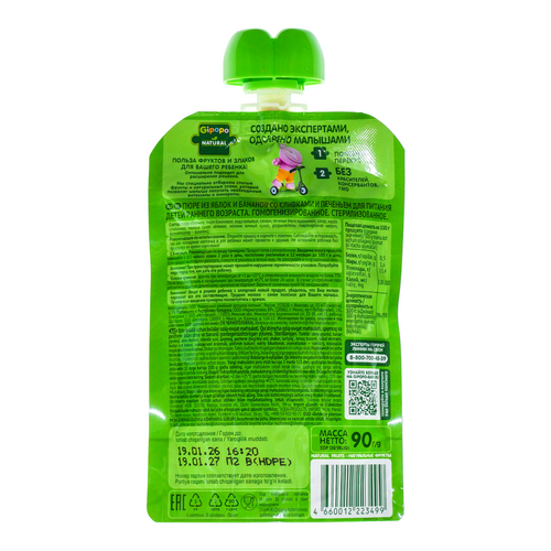 Детские фруктовые пюре с добавлением молочных компонентов Gipopo в удобной упаковке - пауче подходят для питания малышей с 6 месяцев.