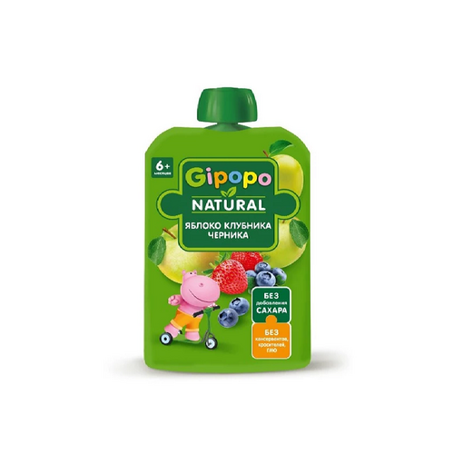 Детское фруктово-ягодное пюре GIPOPO в удобной упаковке - пауче подходят для питания малышей с 6 месяцев. В состав пюре «ЯБЛОКО, КЛУБНИКА, ЧЕРНИКА» GIPOPO входят только натуральные пюре из фруктов и ягод. Детские фруктово-ягодные пюре GIPOPO: - Без добавления сахара - Без консервантов, красителей, ГМО - Удобная мягкая упаковка-пауч Пюре в мягкой упаковке дополняет рацион в процессе взросления –  удобно взять с собой.