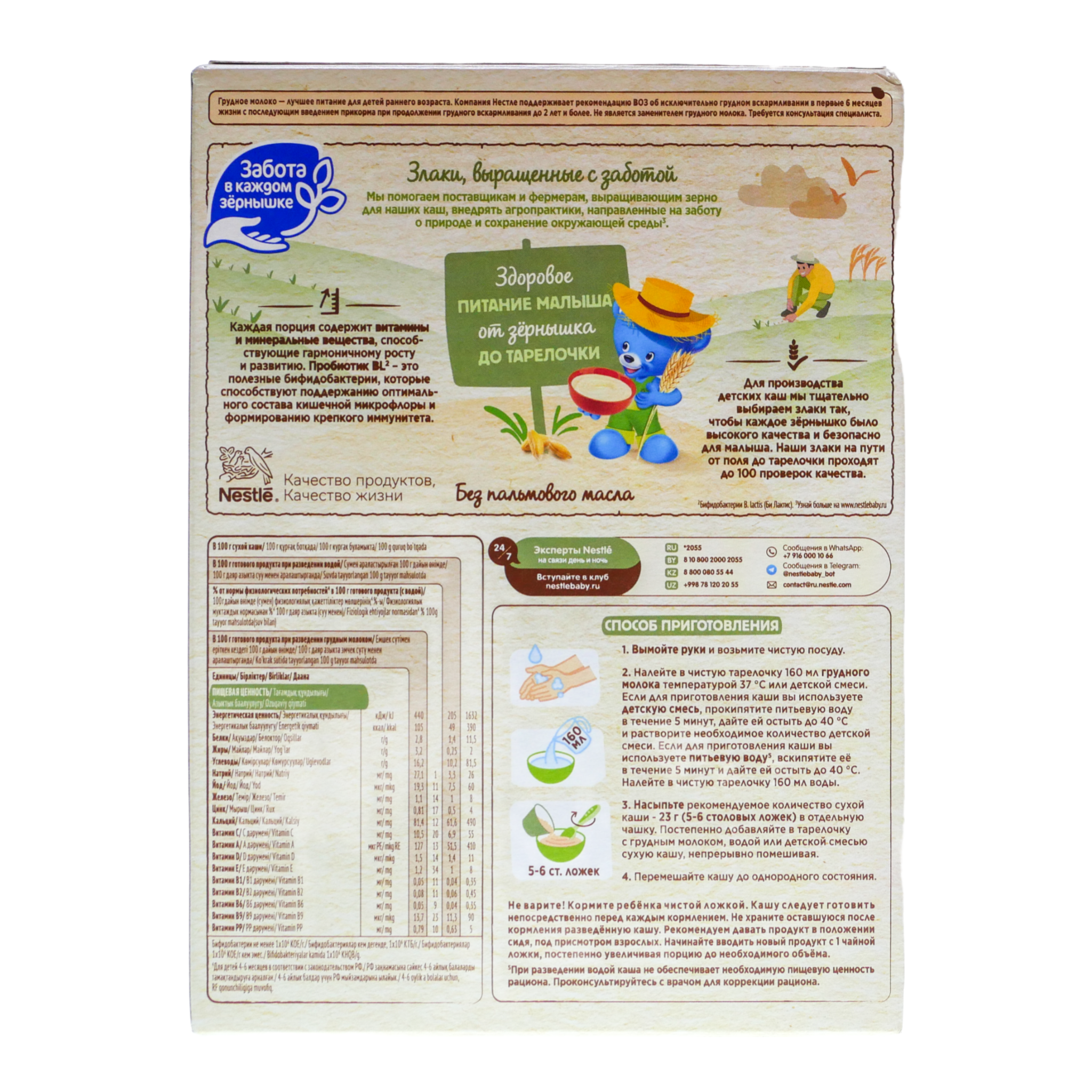 Каша Nestlé® обогащена пробиотиком BL, который способствует нормализации пищеварения, росту здоровой микрофлоры и укреплению иммунитета, что очень важно в период прикорма. Одна порция содержит комплекс витаминов и минеральных веществ для здорового роста и развития ребёнка. Не содержит добавленного сахара, что способствует формированию правильных привычек питания и заботе о здоровье малыша с раннего возраста. Приятный вкус злаков порадует вашего малыша. Без пальмового масла.