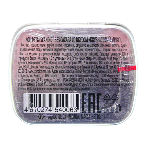 Состав: Подсластители (сорбит, ксилит, сукралоза), регулятор кислотности лимонная кислота, сухие измельченные ягоды клубники, эмульгатор стеарат кальция, ароматизаторы.