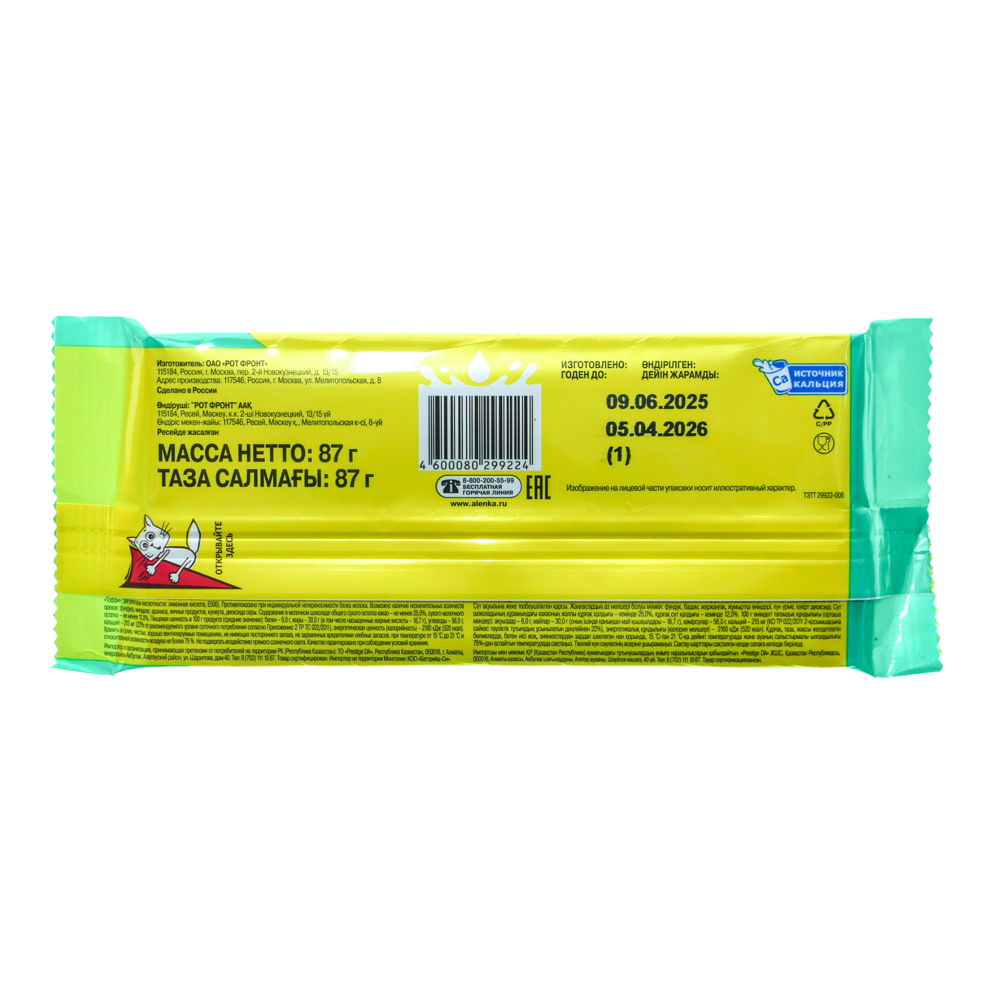 Состав: Молочный шоколад (сахар, сухое цельное молоко, масло какао, какао тёртое, эмульгаторы: лецитин соевый, Е47б; ароматизаторы: «Ванильный», «Ваниль»), начинка (сахар, жир растительный (растительные масла, эмульгатор лецитин соевый), патока, молоко сухое обезжиренное, сгущённое с сахаром цельное молоко (цельное молоко, сахар}, молочный составной продукт сухой (обезжиренное молоко, сыворотка, сахар, масло, ароматизатор), жир специального назначения (растительные масла), печенье-криспи (пшеничная мука, сахар, масло кокосовое, крахмал