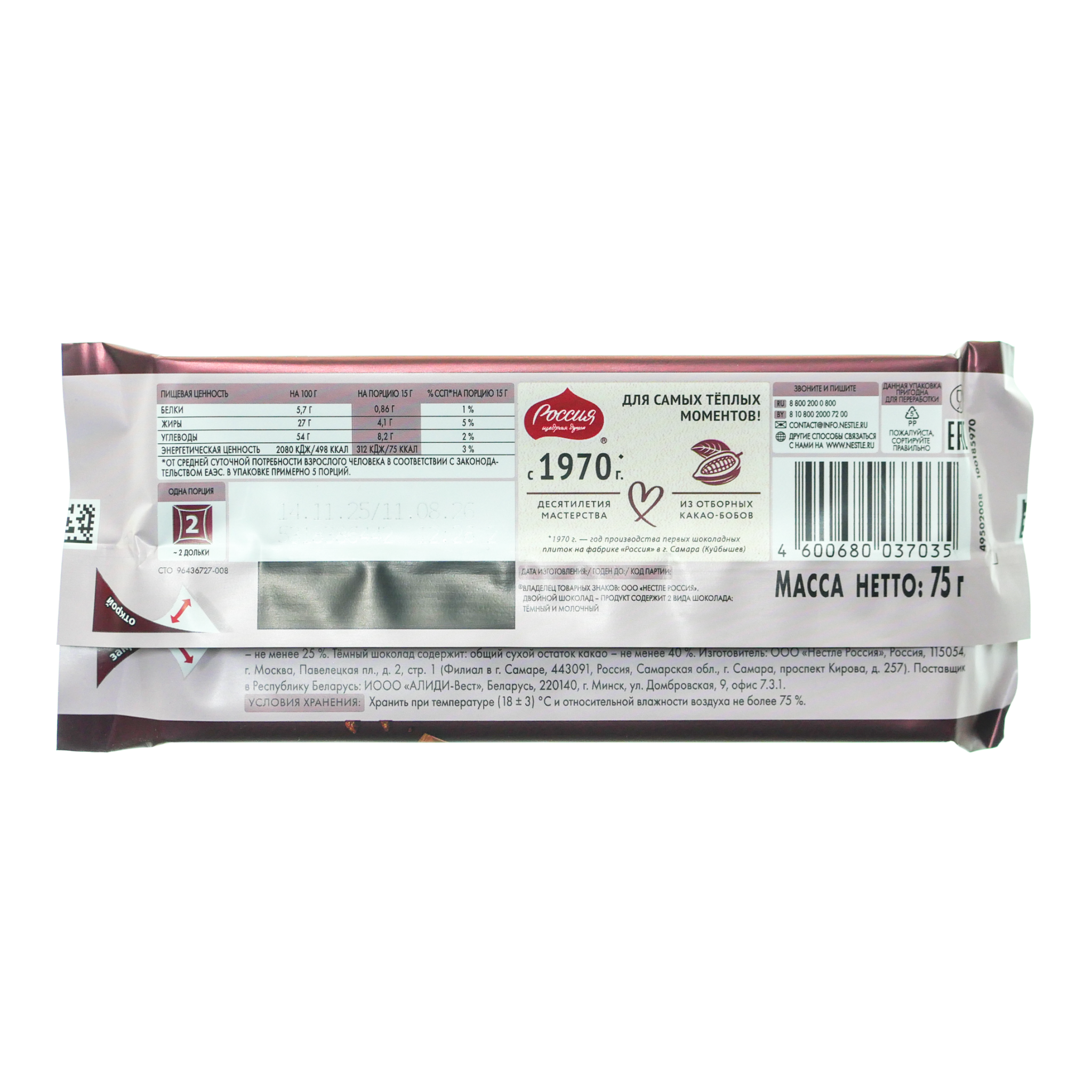 Шоколад Россия 75г темный/молочный с начинкой Нестле