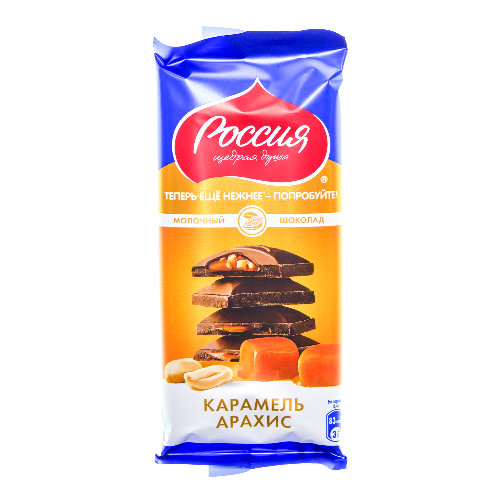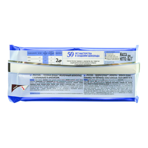 Оригинальный дизайн и не менее оригинальное сочетание вкусов вы откроете с шоколадом «Россия» — щедрая душа!® Молочный шоколад с карамелью и арахисом. Необыкновенное сочетание нежного молочного шоколада с тягучей карамелью и аппетитным арахисом способен приятно удивить даже самых взыскательных любителей сладкого. Тягучая начинка растворяется во рту, а молочный шоколад приятно ломается, стоит его только откусить.