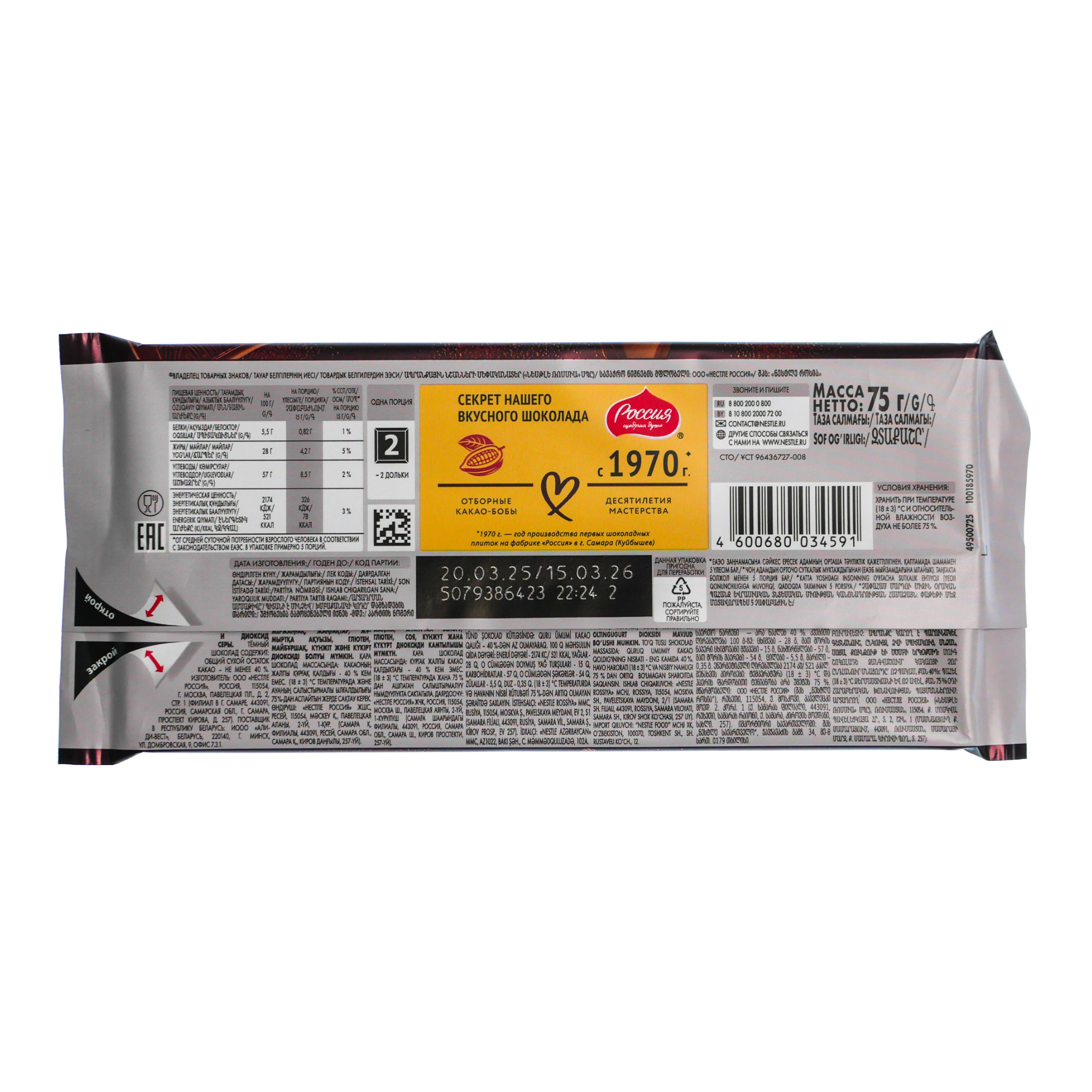 Шоколад Российский 75г темный Нестле
