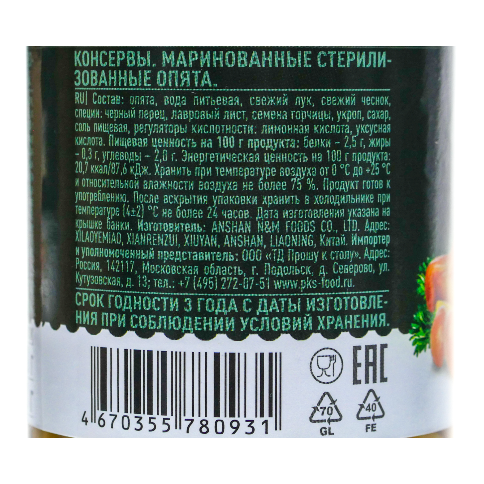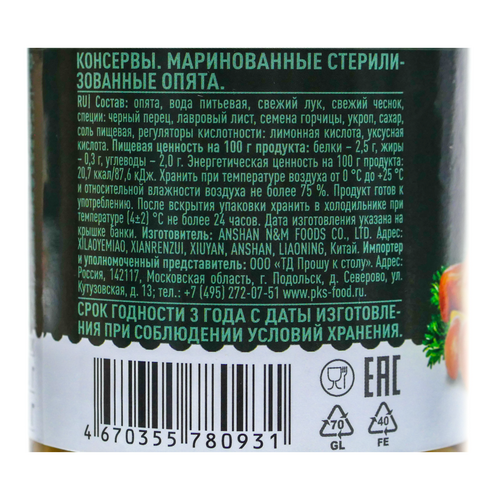 Состав: Опята, вода питьевая, свежий лук, свежий чеснок, специи: черный перец, лавровый лист, семена горчицы, укроп, сахар, соль пищевая, регуляторы кислотности: лимонная кислота, уксусная кислота.