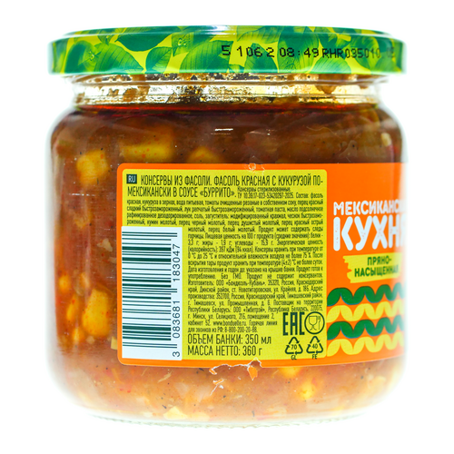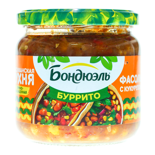 «Фасоль красная Бондюэль по-мексикански, с кукурузой в соусе Буррито» — готовое к употреблению блюдо в упаковке объёмом 350 мл. Фасоль с кукурузой в томатном соусе с добавлением пряностей. Продукт можно подавать в качестве отдельной закуски или гарнира к блюдам из мяса и птицы.  Продукт может содержать след горчицы.