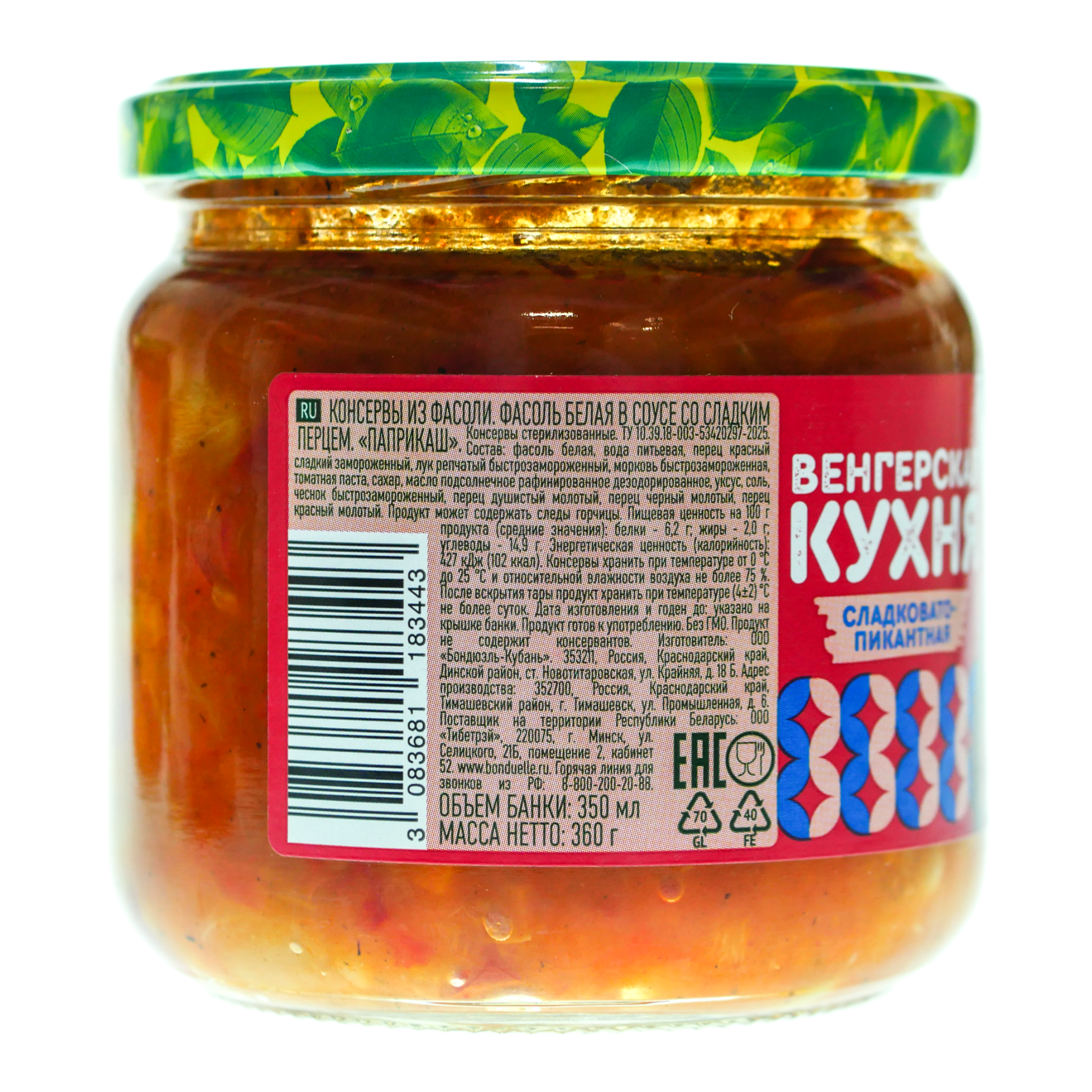 Белая фасоль со сладким перцем в соусе «Паприкаш». Готовые блюда от Бондюэль - это быстрое и вкусное решение, которое позволит вам насладиться аутентичным вкусом Венгрии за считанные минуты. Фасоль от Бондюэль подходит как гарнир, так и как полноценное блюдо. Продукт может содержать следы горчицы.