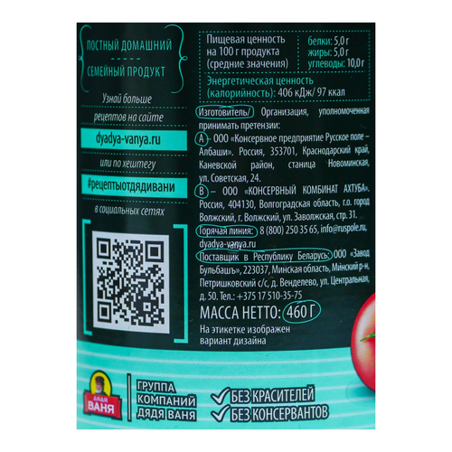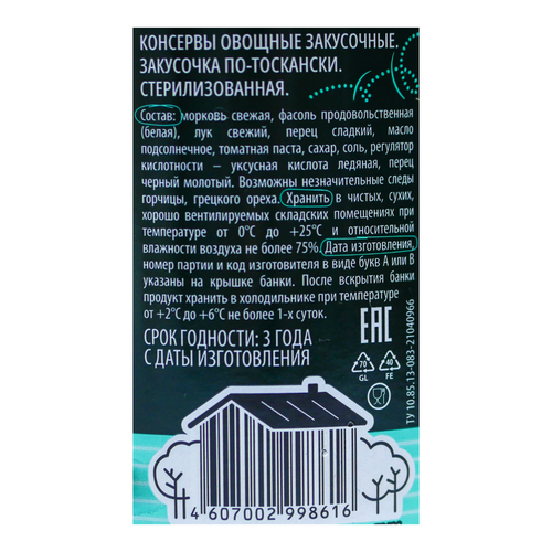 Состав: Морковь свежая, фасоль продовольственная (белая), лук свежий, перец сладкий, масло подсолнечное, томатная паста, сахар, соль, регулятор кислотности: уксусная кислота ледяная, перец черный молотый.