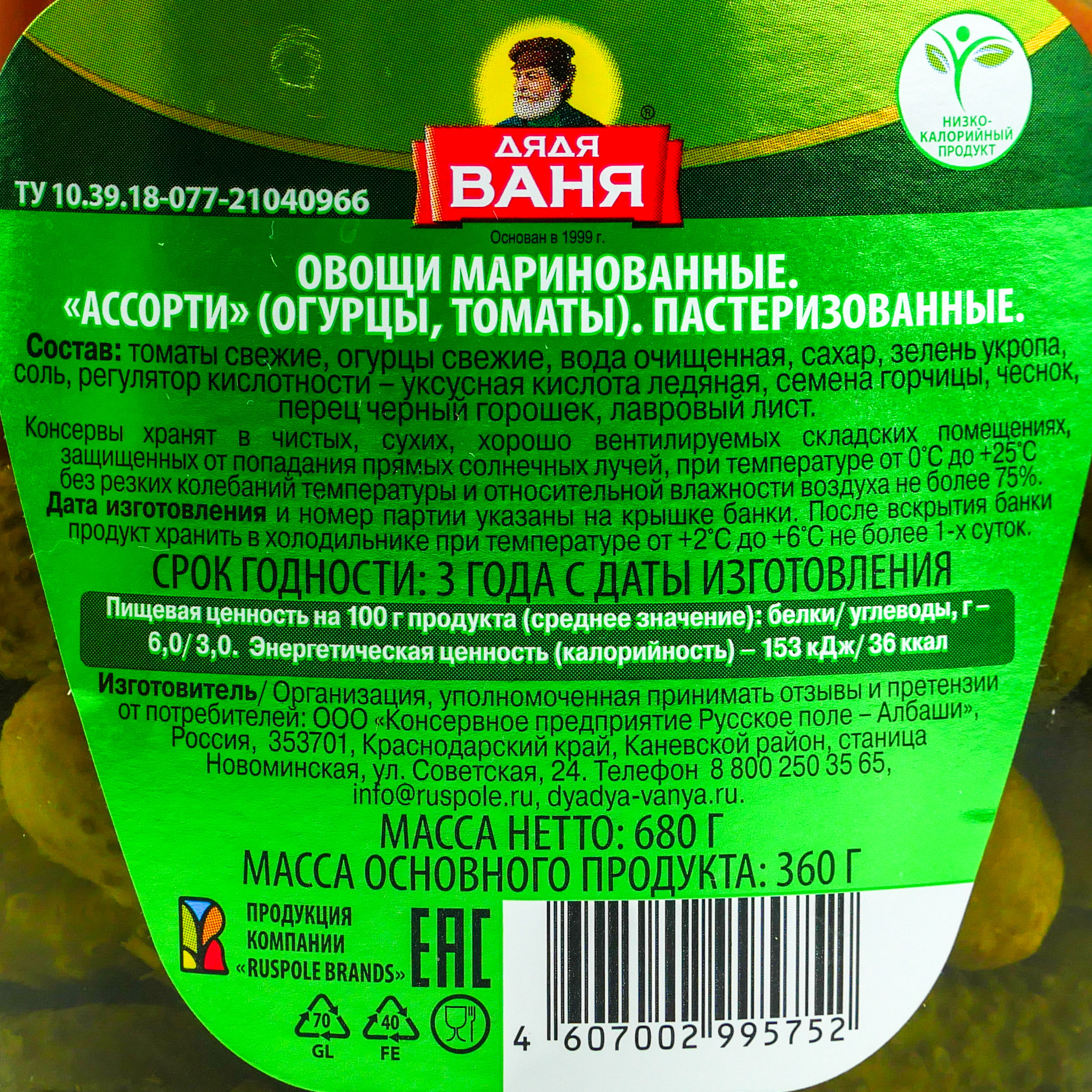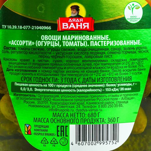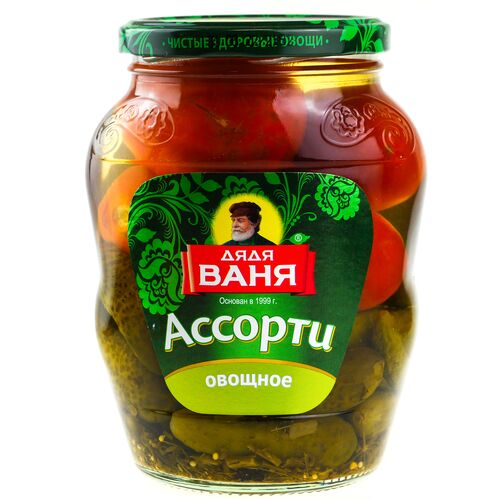 Ассорти овощное «Дядя Ваня» маринованные огурцы-томаты весом 680 г — это закуска из спелых овощей в мягком маринаде. Продукт приготовлен по домашнему рецепту с использованием только натуральных ингредиентов.