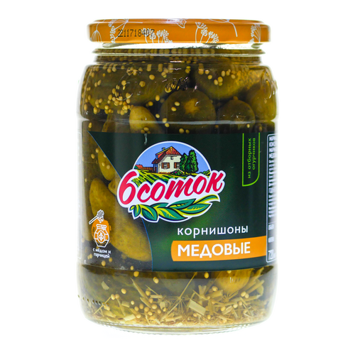 Корнишоны «6 соток» медовые — овощные консервы, маринованные из свежесобранных огурцов с добавлением натурального мёда и свежей зелени. Консервируются в первые часы после сбора, что позволяет сохранить полезные свойства и аромат свежих огурцов. Медовые корнишоны подходят для салатов и различных закусок, а также могут использоваться для приготовления соусов и маринадов.