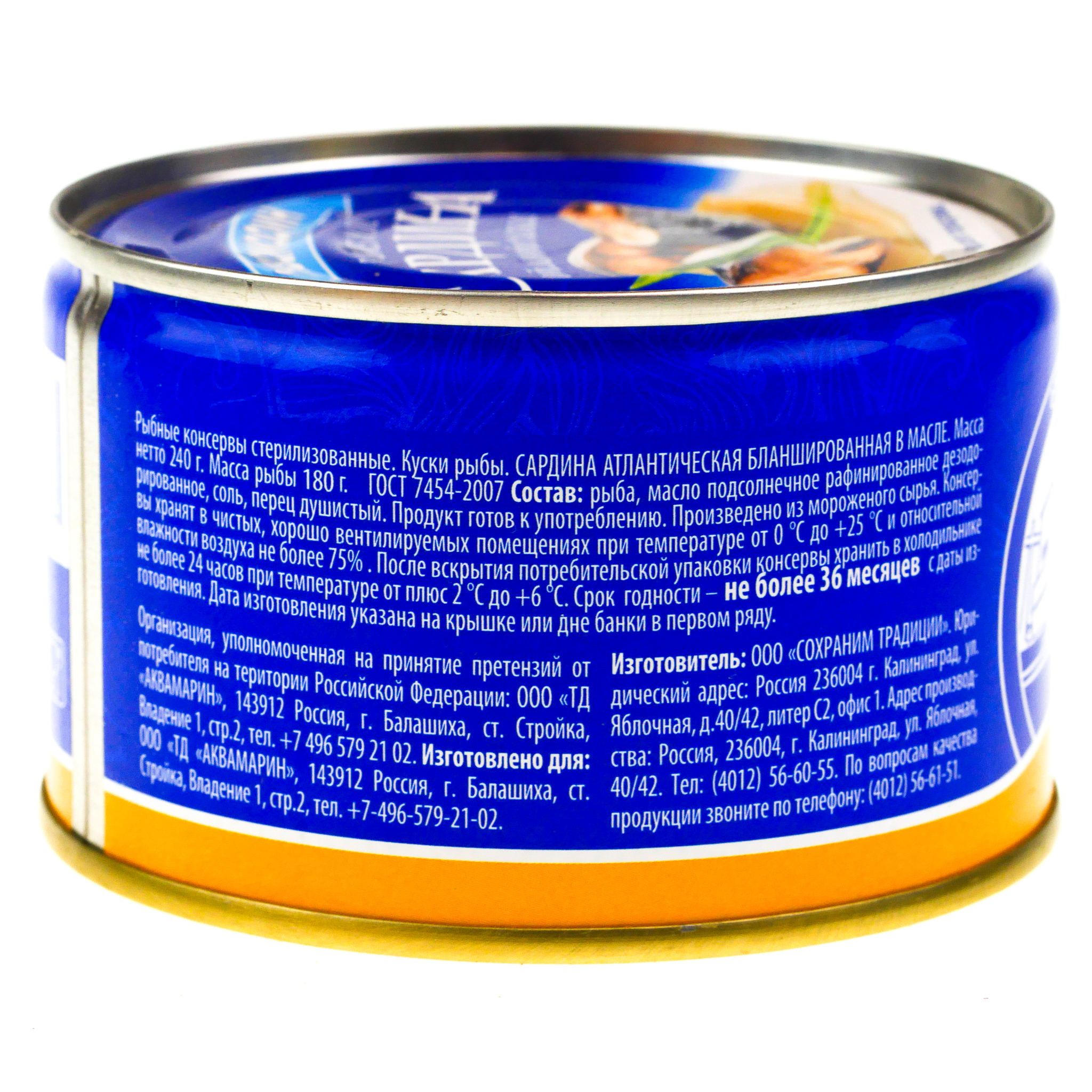 Рыбные консервы стерилизованные. Куски рыбы Сардина атлантическая бланшированная в масле.