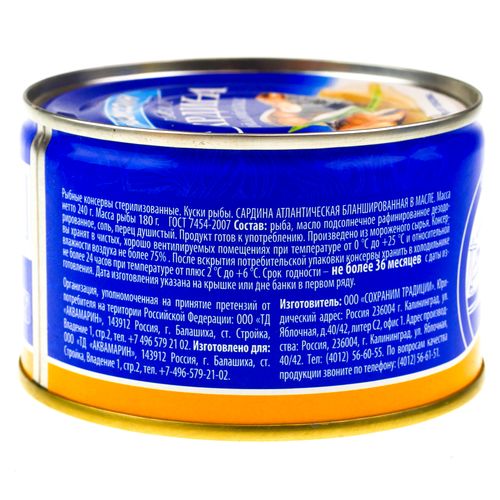 Состав: Рыба, масло подсолнечное рафинированное дезодорированное, соль, перец душистый.