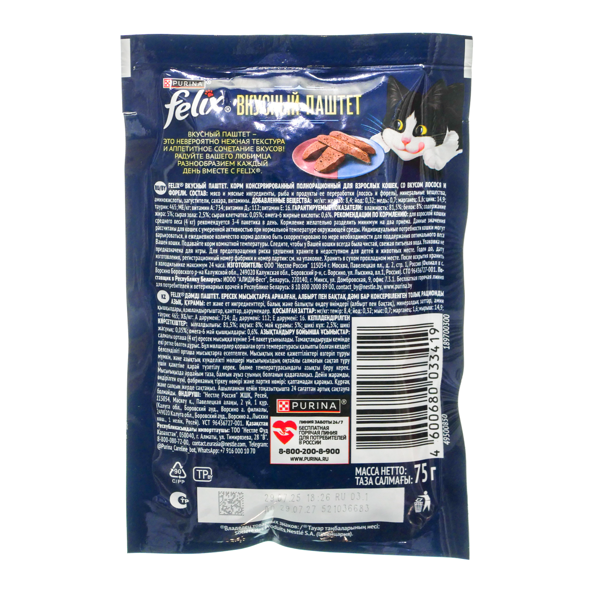 Корм д/кошек Феликс 75г Вкусный Паштет лосось/форель