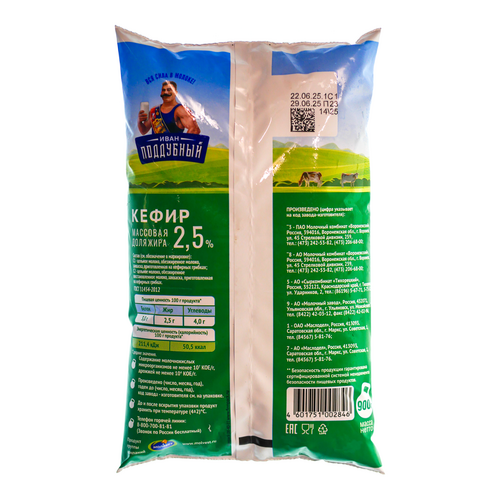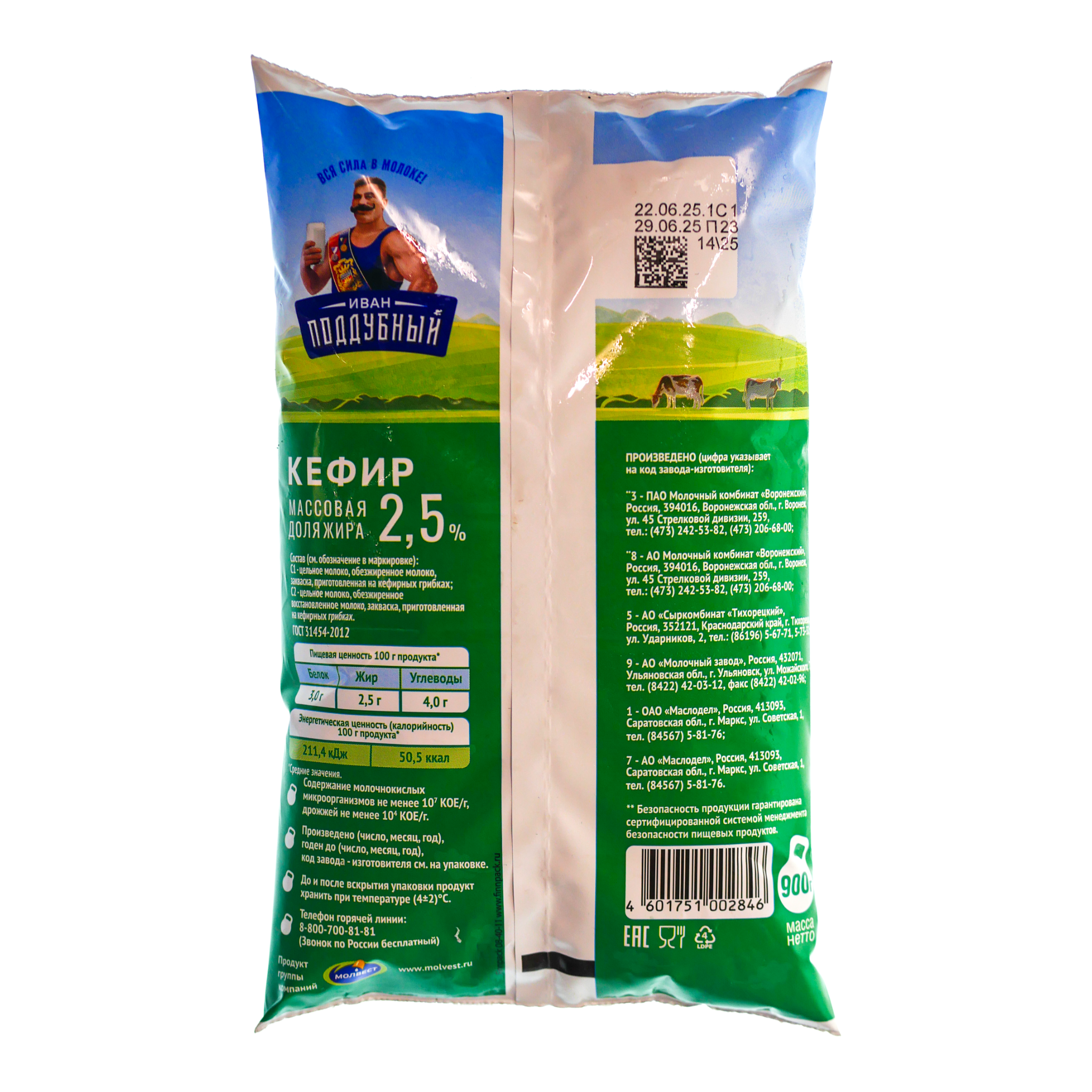 Кефир «Иван Поддубный» 2,5% 900 г — традиционный кисломолочный напиток. Изготавливается из натурального молока и живой закваски, состоящей из молочнокислых бактерий и кефирных грибков (дрожжей). Кефир обладает приятной густотой, соответствующим ароматом без неприятных нот и выраженным кефирным вкусом. Без заменителя молочного жира.
