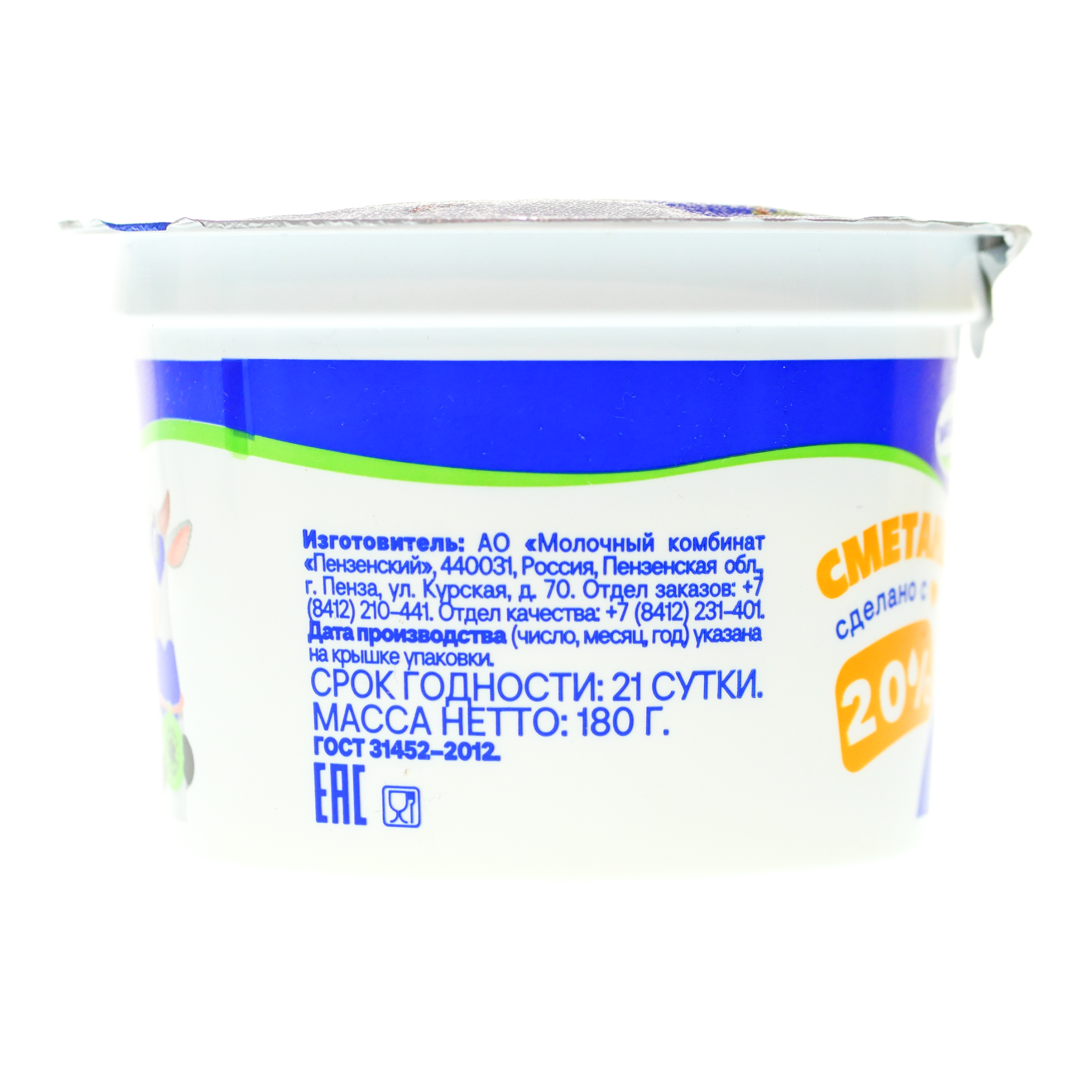 Сметана 180мл 20% ст МолКом БЗМЖ