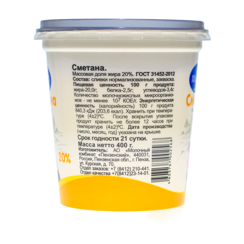 Сметана 15% готовится на основе нормализованных сливок и специальной закваски. Она отличается приятным сливочным вкусом с незначительной кислинкой. Польза продукции обусловлена богатым составом витаминов и микроэлементов, благоприятно воздействующих на организм. Это источник селена, фосфора. Витамины группы В, С и А улучшают функции сердечно-сосудистой и нервной систем. Сметана «Молком» 20% жирности (400 г) подходит для приготовления различных блюд — супов, соусов, выпечки и салатов. Продукт имеет плотную и густую консистенцию, сливочный вкус и насыщенный кисломолочный аромат. Без заменителя молочного жира.